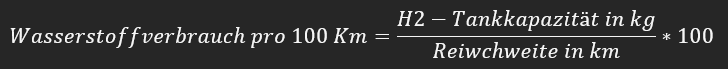Unser Berechnungsbeispiel basiert auf dem Siemens Mireo in der Ausführung als BEMU (Battery-electric multiple unit) sowie als FCEMU (Fuel-Cell electric multiple unit). Die Berechnung erfolgt auf Basis der 3-teiligen Fahrzeugausführung. Anhand der Maximalen Fahrzeugreichweite und der Batterie- bzw. Wasserstofftankkapazität lässt sich ein Energieverbrauch je 100 km errechnen.